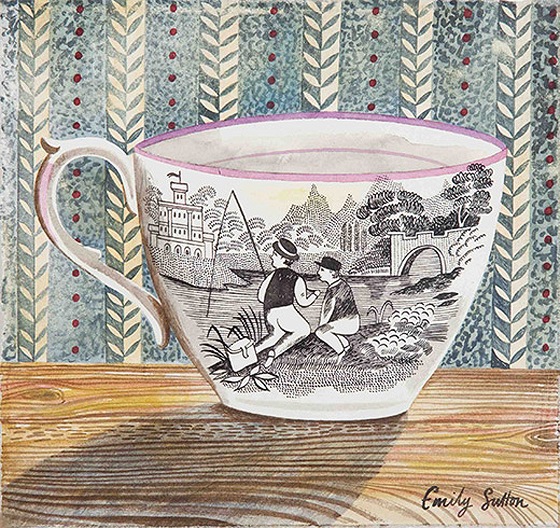 Zpravo, njegove fantastične šolje. Poslednja sličica je ilustracija Raviliousove Queen Elizabeth II Coronation šoljice by Angie Lewin.
